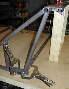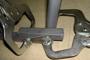 The outside face of the rear bulkhead supports are mounted flush with the inside face of the bottom rail. This provides clearance for the rear suspension links later in the assembly. The one inch offset was established using some scrap tubing clamped to the bottom rail with small flat stock keeping everthing lined up. A "grind to fit" approach was used to establish good alignment and the proper length. The clamping force at the bottom joint was sufficient to hold the support tube in place for tack welding. |