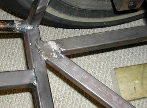 The panhard bracket is positioned on top of the joint between the panhad support cross member and the rear end bottom tube. This region differs from the book on my custom build because I placed all of the tubes below the axle flat on the deck (instead of placing one long bottom tube at an upward angle toward the rear). I did this to provide more clearance for the rear axle in full droop. The technical also elimintated any compound angles needed to install the cross member, and it made it easy to locate a flat area to mount the panhard bracket to the chassis. The angle grinder made quick work of removing filler material on the joint which would otherwise interfer with placing the bracket squarely over the joint.